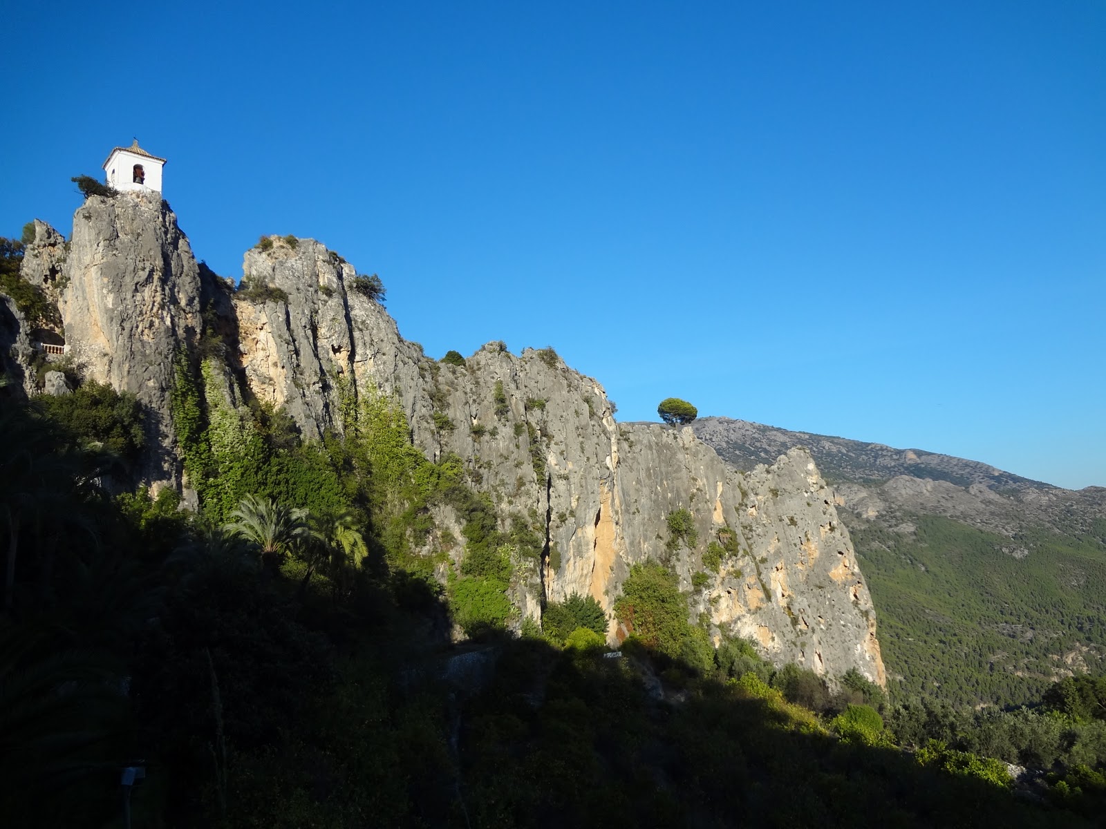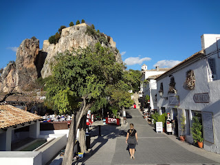 All the negativity was not able, though, to diminish the exhilaration we felt about both the now to a great extent crumbled forts, still impressive, by virtue of their location, and the amazing panoramic view of the strikingly beautiful landscape around us. Some of the mountains were bathed in the now reddish glow of the late afternoon sun, and the dammed Guadalest drinking reservoir is no less than stunning, with its emerald color, lined with what from a distance looks like white, sandy banks leading up to the terraced hillsides, reaching all the way up to the timberline and beyond.